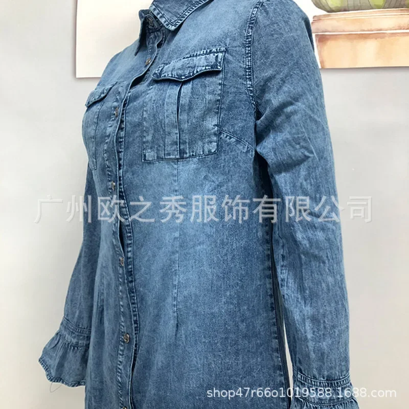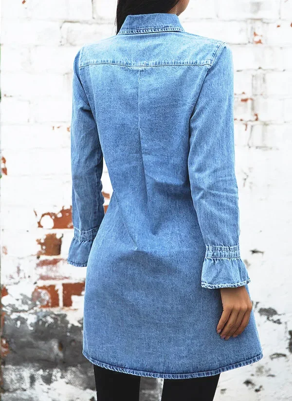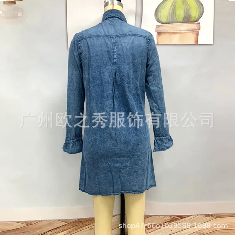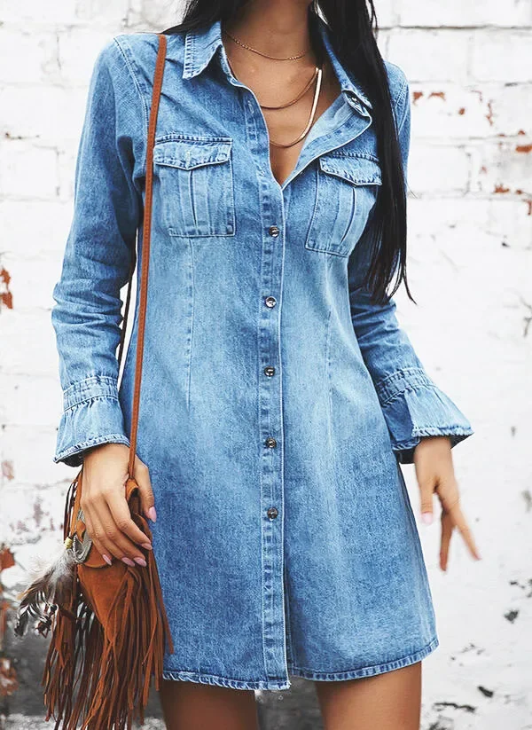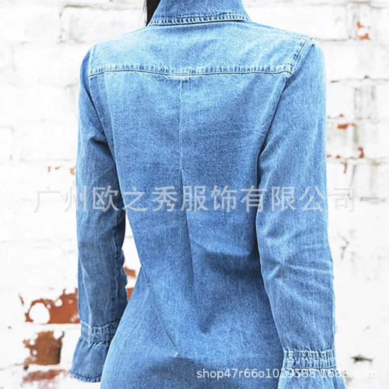 Women Denim Dress Long Sleeve Single Breasted Loose Fit A Line Dresses Turn Down Collar Splice Office Lady Elegant Vestidos